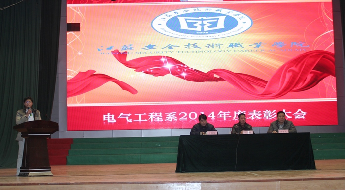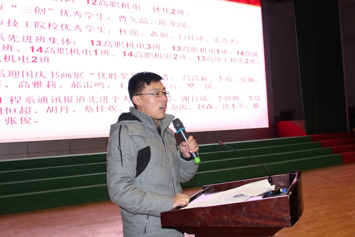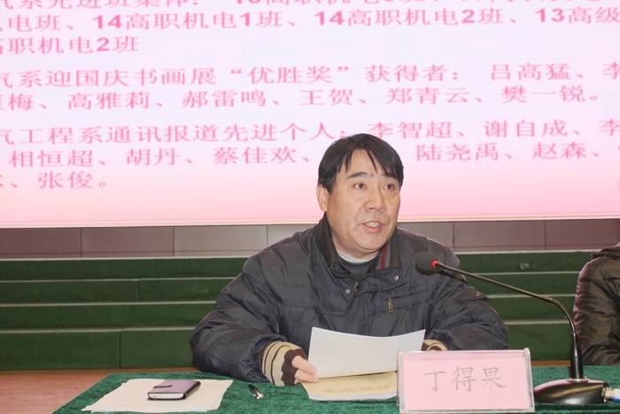 12月17日下午4:00,电气系组织全系员工在文化中心,隆重召开电气系2014年度表彰大会。电气系学管主任张克生担任主持。电气系行政主任姜玉柱、党支部书记丁得果、教学主任周忠彦出席大会并作重要讲话。 气势恢弘的国歌声拉开了电气系2014年度表彰大会的序幕。电气系行政主任姜玉柱宣读了《关于表彰2013-2014学年第二学期奖学金获得者的决定》、《关于表彰2014年省市校先进集体和先进个人的决定》,周忠彦主任宣读了《关于表彰2014年度卫生先进集体的决定》、《关于表彰系部活动先进集体和个人的决定》。随后,系部领导为受到表彰的集体和个人颁奖。之后,12高职机电2班的李亚男同学代表获奖员工发言;13高职机电3班班主任吕猛老师代表获奖班集体发言。 系党支部书记丁得果作总结讲话。丁书记向本年度取得优异成绩的先进集体和个人表示热烈的祝贺,并向员工们提出了殷切的期望。期望全系员工要以先进集体和个人为榜样,树立争优创优的信念,关注个人全面发展,努力学习科学文化知识、提升专业技术水平、陶冶个人情操、再接再厉,争取取得更加优异的成绩。 文:王劝 图:相恒超