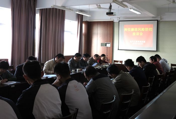 10月24日下午,电气系召开岗位廉政风险防控座谈会。纪委书记成伯君、纪检监察室副主任刘军等出席会议。电气系书记丁得果同志、主任王郝同志、副主任侯春、吕猛以及关键岗位人员、教师代表、员工代表参加了此次会议。