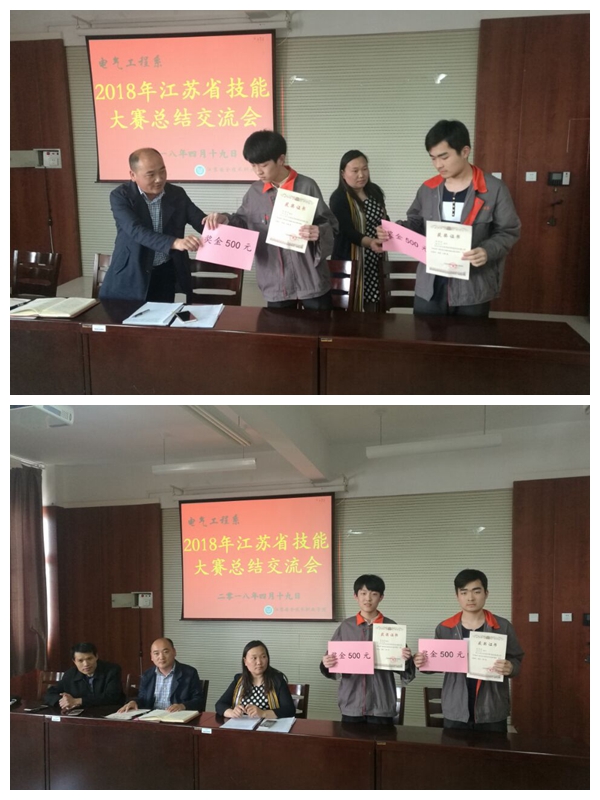 曾宪峰老师指导、14高职电气自动化班陈春虎、张保东同学组成的参赛队,在2018年江苏省高等职业院校技能大赛“亚龙杯”现代电气控制系统安装与调试赛项荣获三等奖。陈春虎、张保东同学在会上介绍了自己的成才之路和成功经验。王主任为两名获奖员工颁发奖状与奖金500元。