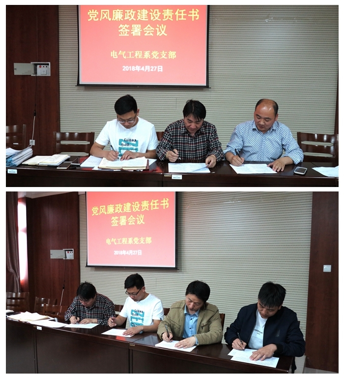 4月27日下午,电气系在309室召开党风廉政建设责任书签署会议。电气系党支部书记丁得果、主任王郝、副主任吕猛出席会议并讲话。