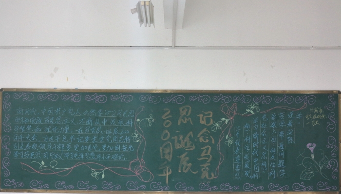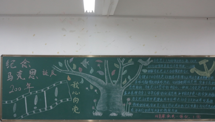 为缅怀马克思的历史功绩,重温马克思的崇高精神,电气系组织各班级开展“纪念马克思诞辰200周年”黑板报评比活动。