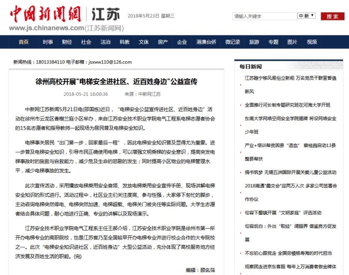此次中新网江苏新闻对公司“电梯安全知识进社区,近百姓身边”大型公益活动的报道,充分展示了公司良好的社会知名度与美誉度,为公司更好地服务地方经济社会发展注入持续动力。