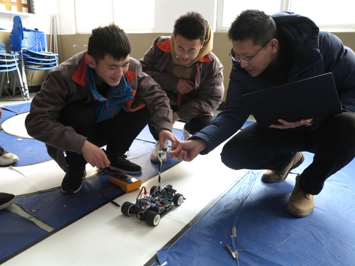 宋陆昊老师、朱帅帅老师指导的机器人团队在2018第九届淮海经济区机器人大赛中荣获一等奖两项、二等奖一项的好成绩。机器人社团在两位指导老师的指导下,组员责任心强、动手能力强,学习兴趣浓厚,感染了和吸引了很多机器人爱好者的观看、学习。宋老师边用电脑控制,边耐心的和员工们讲解操作的原理,在实践操作中,把专业知识融汇其中,极大调动了员工们的积极性。